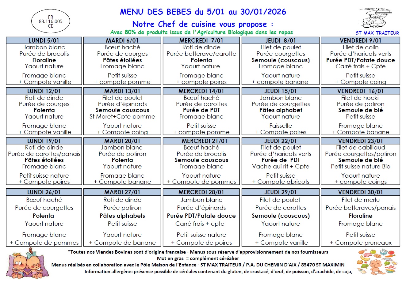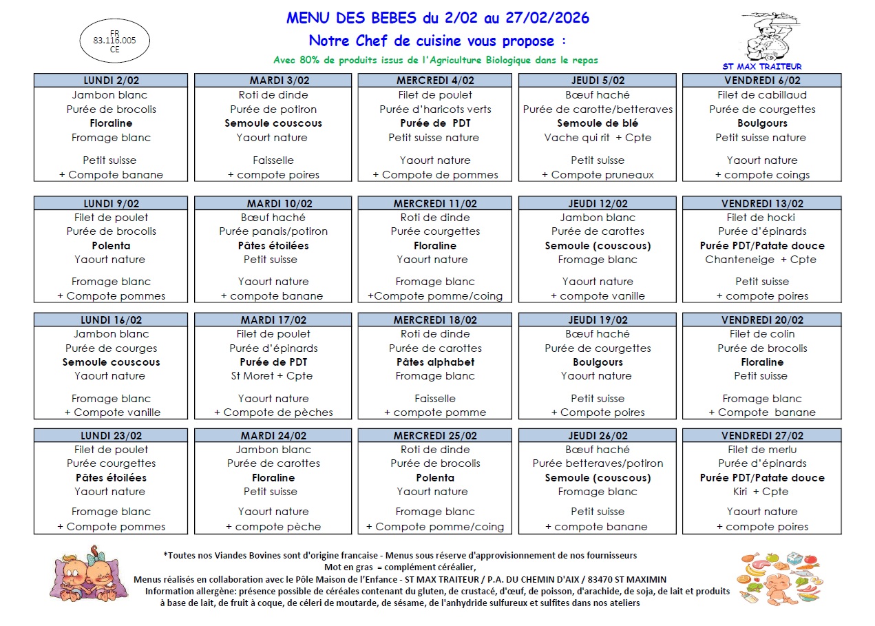 Les repas sont adaptés en fonction de l’âge (menu bébé et menu grands).
