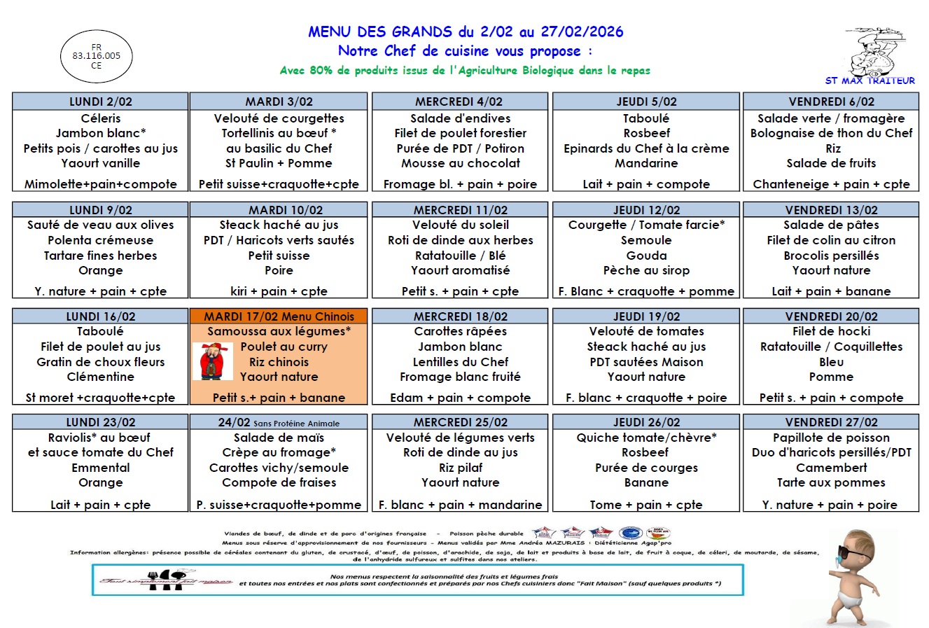 La Commission intendance composée des infirmières salariées de “La Maison de l’Enfance Francis Barrau” intervient auprès des directrices et de notre prestataire “St Max Traiteur” afin de veiller au respect du bon équilibre alimentaire et de la qualité des repas servis aux enfants.